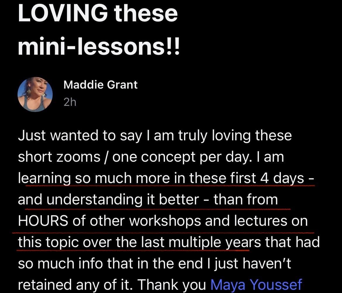 Maya’s teaching style resonated deeply with me because it was very practical and understandable. Maya also has a sparkling, charming personality and her classes are a lot of fun!